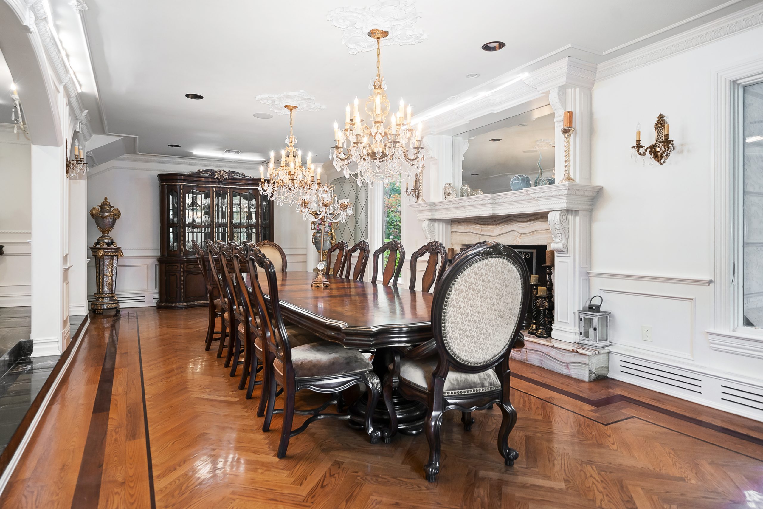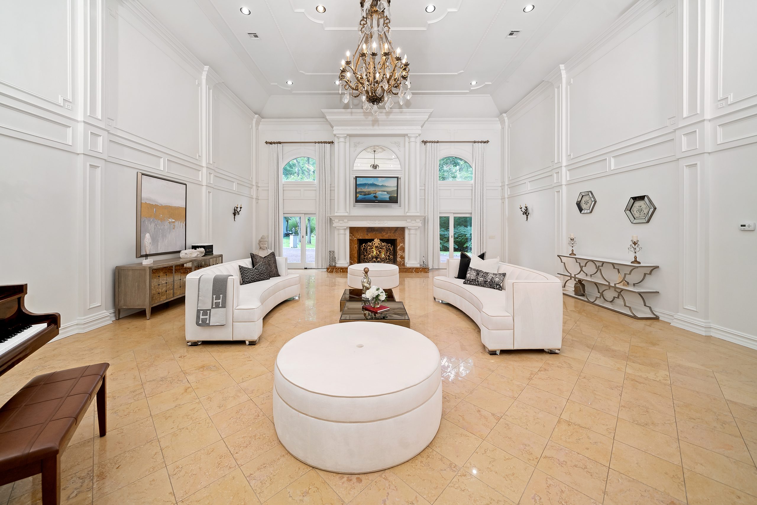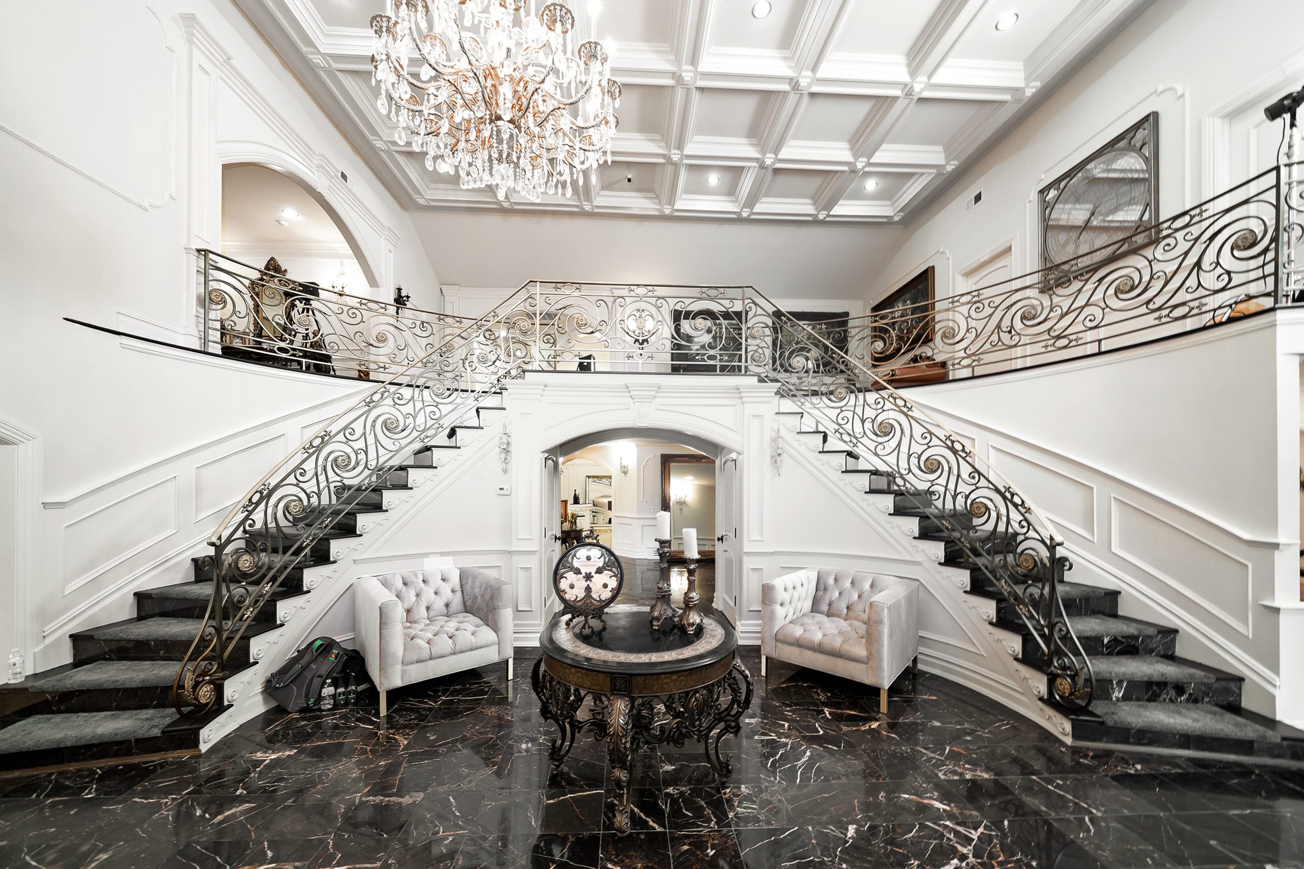 The entryway of Guidice’s home sets the tone for the luxurious attention to detail throughout. The two-story grand entry foyer is light and bright with marble floors and an elevated ceiling. The focal point of the entryway is the oversized Cinderella staircase illuminated by an opulent chandelier.