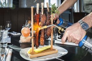 Chef David Burke is a long-standing culinary pioneer of the modern American kitchen, impacting the food industry from a multi-faceted standpoint. Burke is the owner of several world-class restaurants all over the country. As the culinary director of Asian-Cuban American fusion restaurant Ventanas in Fort Lee, New Jersey, the sky’s the limit for fun and entertaining styles of food. Burke’s playful “Clothesline Bacon” suspends crisp, thick-cut strips of bacon coated in a spiced jalapeño and pineapple syrup for an unforgettable experience. The torched bacon uses gravity to drip its flavorful fat onto a pickle placed below, reimagining the concept of the household ingredient entirely.