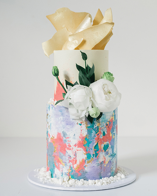 From an aesthetics standpoint, Luu’s cakes make a strong visual impact. They’re tall, colorful and intricately detailed. He uses tempered chocolate to make sails as cake toppers; isomalt for glassy, ice-like shards; drip techniques; luster dust for shine; and buttercream brushstrokes that give them their signature abstract texture. By the end, they more so resemble a type sculpture or painting as opposed to something edible.