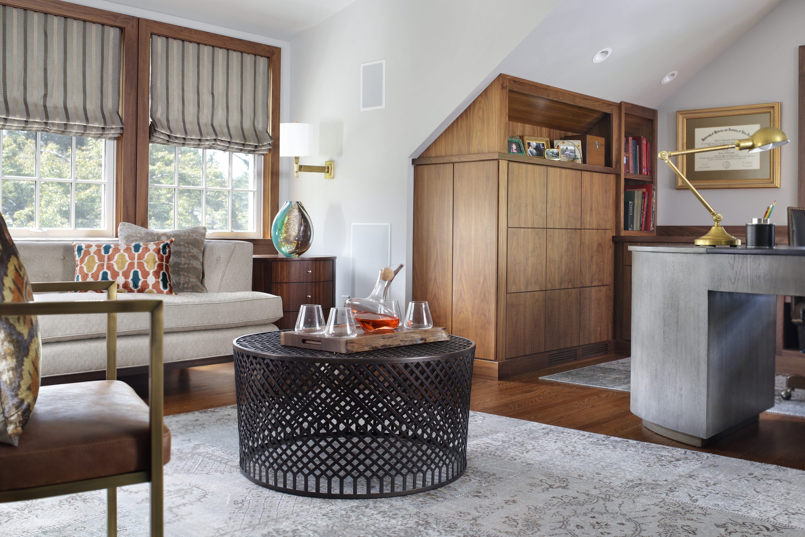 The office has a modern approach with angled ceilings and hints of red grandis. There is a wall that lays underneath the angled ceiling that has what looks like a stack of cubes, but is actually a discreetly placed filing cabinet that uses the ceiling lines to appear hidden. This office has a prominent, vertical line pattern throughout, so an oval desk was used to soften the lines and create a focal point. Elegant, veined walnut cabinets encompass the space and create uniformed movement through minimalistic detail which complements the simplicity of the window treatments. The windows are covered with Roman shades which efficiently eliminates the glare from the room by filtering the light without blocking it. Incorporating sconces on the walls allowed for overhead and over-the-shoulder lighting, while omitting the need for floor lamps, conserving space and preventing clutter in this office.