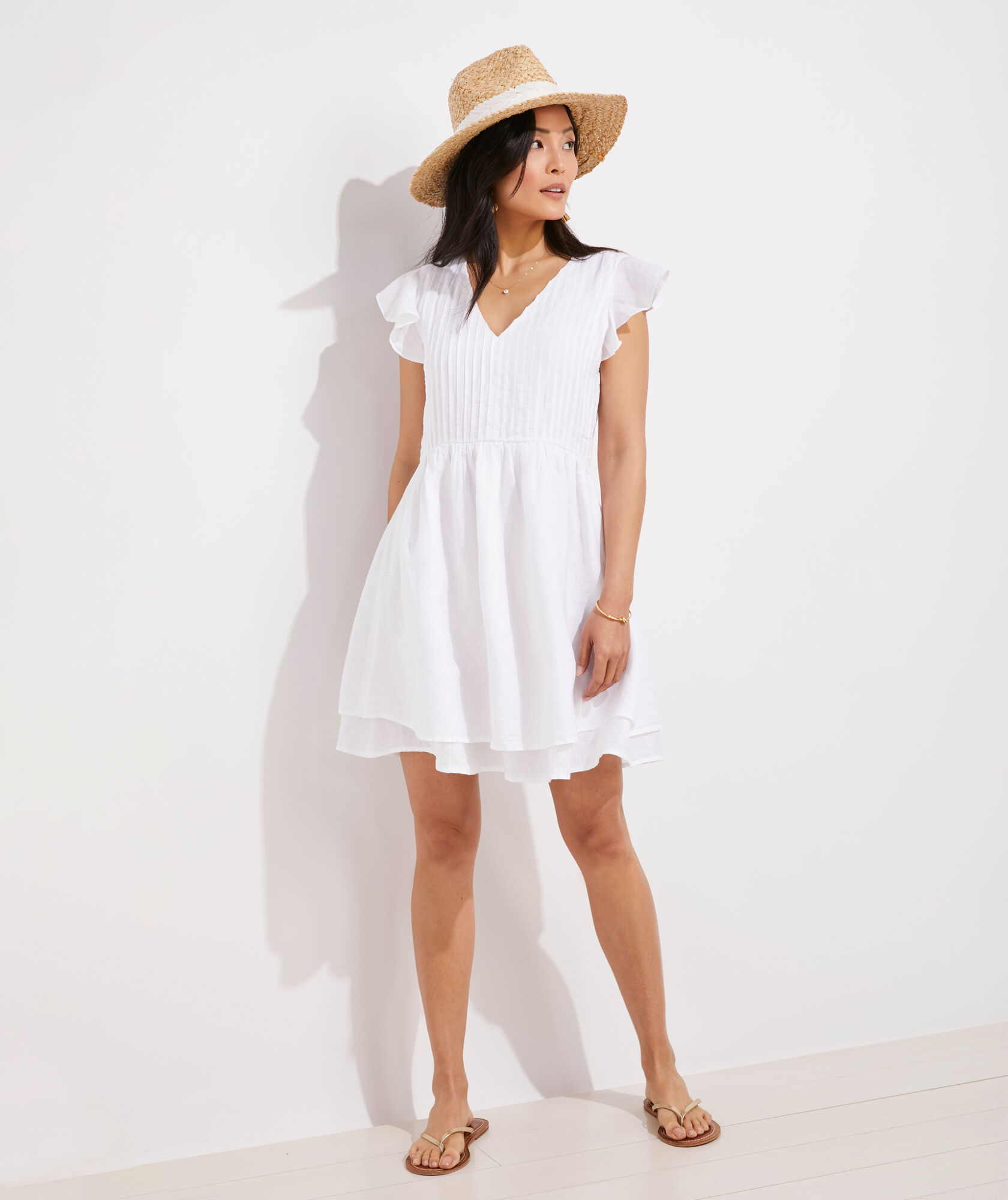 This white linen dress is made for strolling on the beach or for a nighttime outing with its fitted bodice, flowing skirt, and Pintuck detailing on the chest and back of the bodice. The versatile design is for casual and elegant events. With its classic style, this dress is a seasonal favorite that finds itself in every summer season’s essentials.