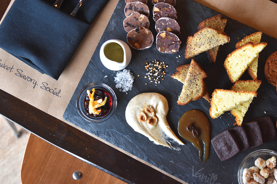 While admittedly their dessert “charcuterie” boards come with a bit of a learning curve, Boyer doesn’t want that to intimidate you. Inside Vanillamore’s pastry display case, guests can find both the chocolate and vanilla charcuterie boards laid out with note cards that characterize what’s what. Each board comes with two of their “salamis” which are not actually made of meat, but rather dried fruit and either dark, milk, or white chocolate. There’s also cookies, doughnuts, and slices of cake mimicking toast; some sort of macerated or candied fruits; caramel sauces and mousse that act as the spreads; and accents to bump up flavor and texture such as sprinkles of fleur de sel, olive oil, candied nuts clusters, sesame seeds, and lemon peel.