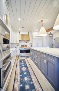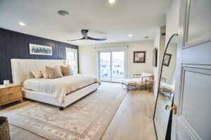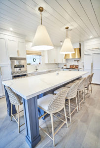Dramatic, wide board and batten trim by Metrie, are placed throughout the home to add a coastal aesthetic and dimension to each space. Shiplap throughout the home ties in the waterfront and farmhouse feel that Jamie-Rae was seeking. In working with Metropolitan Floors, Kentwood’s Brushed Oak Whisker engineered hardwood was laid throughout the space. Using both a traditional and herringbone design, each room and hallway has its own unique path.  Each tile accent was carefully selected from a variety of manufacturers including one of Jamie-Rae’s favorites Cement Tile, in which a traditional checkered look was used in the laundry room. Lighting fixtures and ceiling fans throughout the home were provided by Generation Lighting. Each fixture was carefully selected to complete the space, from the oversized warming pendants in the kitchen to the sprawling farmhouse fans in the living and bedroom.