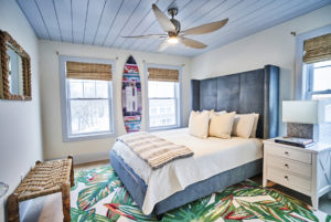 Moving to the upper level of the home, multiple grand bedrooms, bathrooms, and a loft space are found. Each of the four  bedrooms embrace a coastal ambiance, anchored by custom upholstered beds designed and manufactured by Jonathan Louis. The brand’s vast array of fabric colors and textures made it possible to achieve a unique personality in each room, and the beds’ hidden storage drawers – a welcomed bonus feature – stow away any clutter to add to the rooms minimalistic designs. Accent pieces including the Alma Chair and ottoman, Gala Floor Mirror and oversized Zaragoza wool rug from McGee and Co, add the final finishing touches to the master suite.